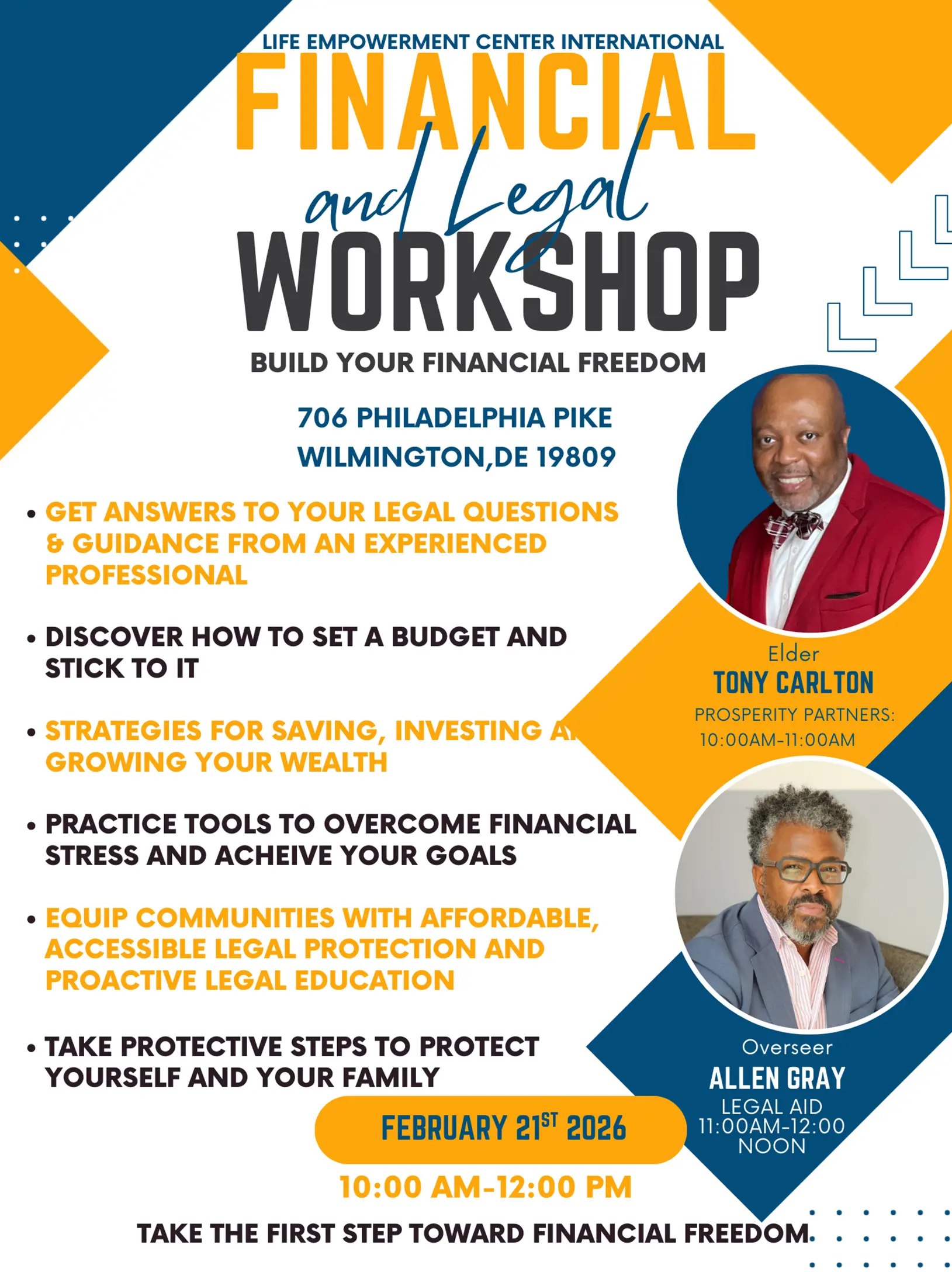 Feb 21 Financial & Legal Workshop 10:00 am - 12:00 pm Life Empowerment Center 706 Philadelphia Pike, Wilmington Event Details Get Directions
